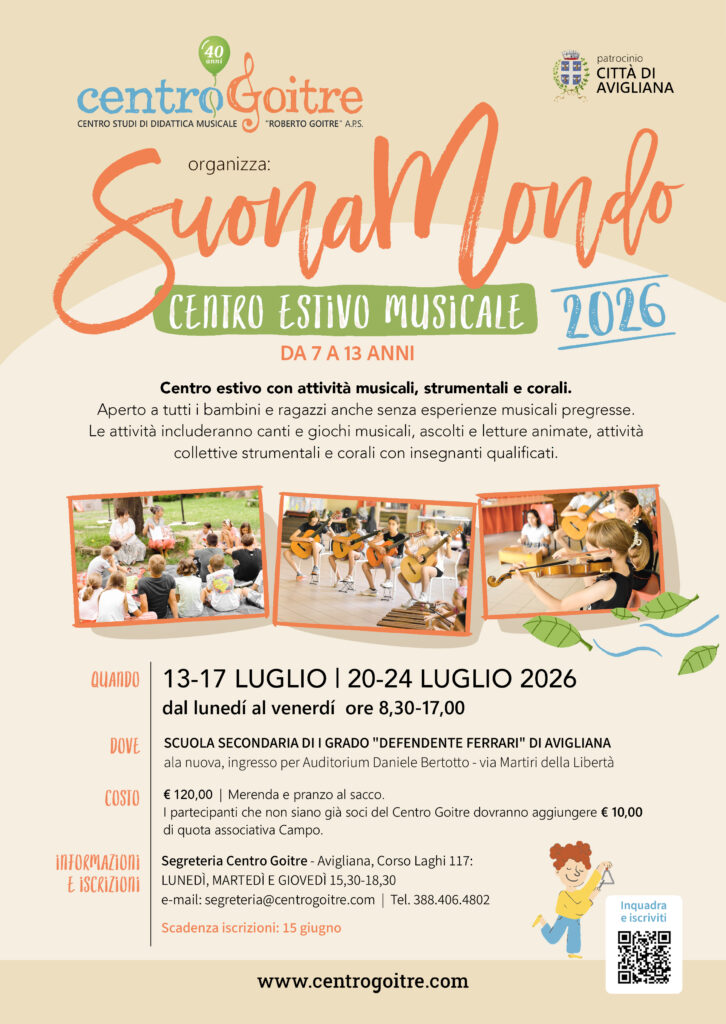 Sono gli stessi docenti che durante l’anno portano avanti i laboratori collettivi e le lezioni di strumento dell’associazione, impegnata da oltre quarant’anni nella ricerca e nella sperimentazione didattica. Suonamondo è quindi anche un’occasione per conoscere da vicino l’approccio del Centro Goitre e, per chi non fosse ancora socio, per entrare a far parte della sua comunità.